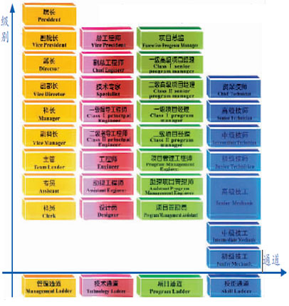 管理通道是最常见的行政职务,研究院里从科长到院长有69人,只占总人数的5%。技术通道是从设计员到总工程师,待遇与副院长同级,是为那些喜欢做技术的员工准备的。项目通道则是为既懂技术而长于项目管理的员工设立,从项目管理员开始最高可以做到项目总监,待遇与总工程师同级。