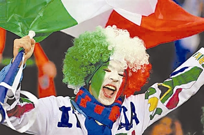 6月14日,一名意大利队球迷在比赛开始前为球队呐喊助威。