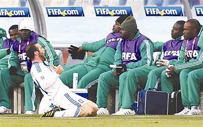 希腊队球员托罗西迪斯攻进本队第二粒进球后跪在场边仰天怒吼。他前面的尼日利亚队替补球员面无表情。