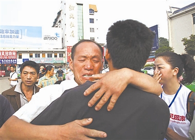 6月15日,贵州省黔东南苗族侗族自治州凯里市,儿子被拐卖13年后,潘厚江一家终于得以团聚。1990年,凯里市舟溪乡的村民潘厚江带着妻子杨文慧和两个儿子来到贵阳打工。1997年12月,7岁的小宝陪同小朋友到学校时,被一名女子拐走。而这一去,就是13年。 2010年6月15日,贵州省黔东南苗族侗族自治州凯里市,在“宝贝回家”网志愿者的帮助下,小宝终于找到了家人,同儿子失散13年的潘厚江一家终于重新见到了儿子。 徐丰山 摄