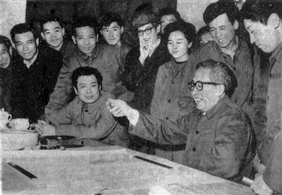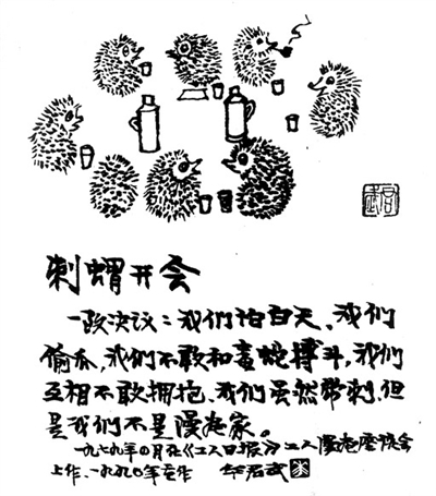 1979年4月华君武在工人日报社举办的漫画座谈会上为职工漫画作者挥毫示范,即兴创作了漫画《刺猬开会》。