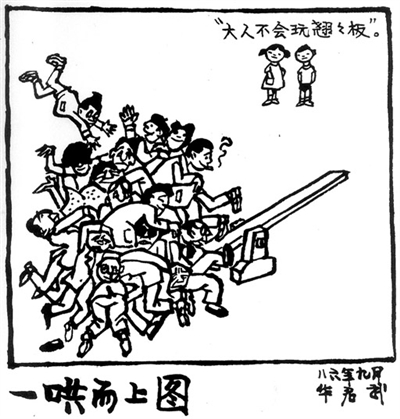 我还记得,《工人日报》先后举办了三届“职工漫画大赛”和两届“黑白漫画大赛”,华君武对于这几次“出作品,出人才”的漫画赛事十分关注。他仔细观看刊登的每一幅参赛作品,对有新意的作品和有苗头的新作者都写文章鼓励,文字虽不长,却益于青年作者一生的茁壮成长。评选时,他对件件画稿都认真推敲、直言点评。评委们感慨地说:华老对职工的漫画太亲了!