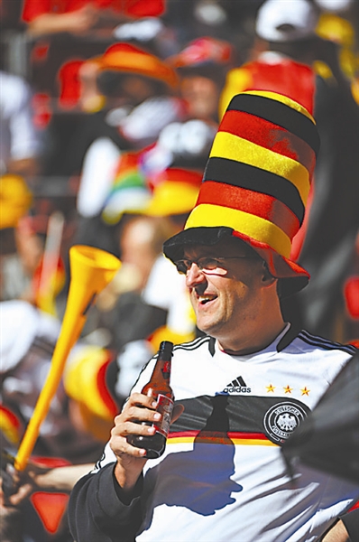 6月18日,一名德国球迷手持啤酒静候开赛。 新华社记者 杨磊 摄