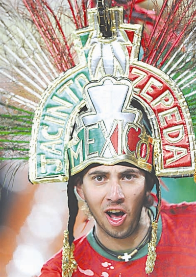 6月17日,一名墨西哥球迷赛前为球队加油助威。 新华社记者 李尕 摄