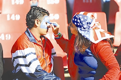 6月18日,一名美国队女球迷(右)在比赛前为同伴在脸上涂画。