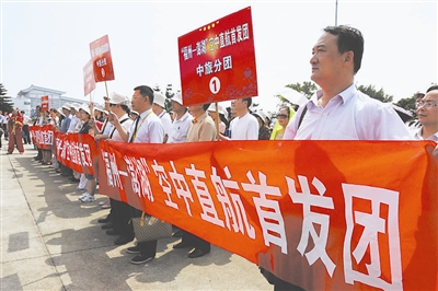 6月21日,乘坐福州—澎湖空中直航首个航班的福建省首航团成员在机场外整装待发。