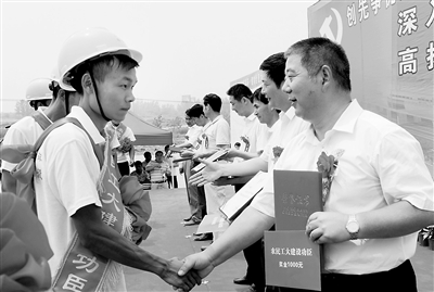6月20日,中铁四局在合肥铁路枢纽南环线工程建设工地表彰党员先锋岗标兵,迎接建党89周年。担负着合肥铁路枢纽南环线工程建设任务的中铁四局,在一线的数千名党员和建设者中开展“高扬党旗战南环,建功合肥大建设”创先争优党建主题活动,安全、优质、高效地完成施工生产任务。李晓明 摄