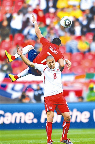 6月21日,智利队球员阿·桑切斯(上)与瑞士队球员格·因勒争顶。新华社记者 杨磊 摄