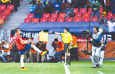 6月21日,智利队球员阿·桑切斯进球后庆祝。但是这个进球被判无效。当日,在伊丽莎白港曼德拉湾球场举行的2010南非世界杯足球赛H组第二轮比赛中,智利队1比O击败瑞士队。 新华社记者 杨磊 摄