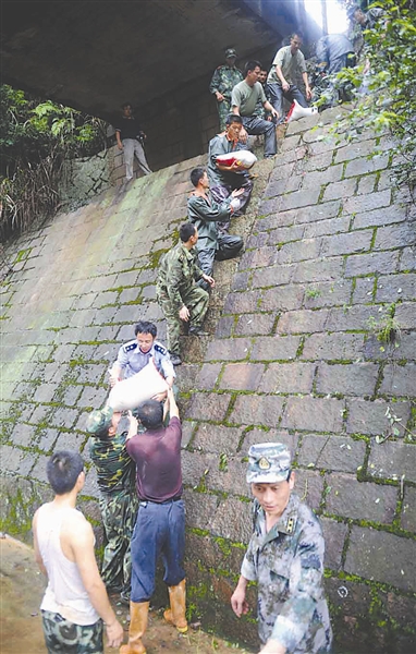 21日早上,一批救灾人员带着500公斤大米以及油料、食盐、消毒药品,进入受灾严重的马头山镇救助受灾群众。