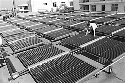 6月21日,山东青岛即墨市即发集团的技术工人正在厂区楼顶检查太阳能热水集热装置。该企业通过采用太阳能集热技术来预热染色工艺软化水,从而大量节约了原来加热用的蒸汽。