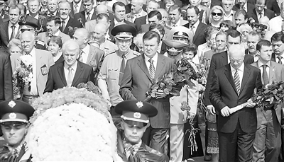 6月22日,乌克兰总统亚努科维奇(中)、总理阿扎罗夫(右)、议长利特温(左)在基辅举行的纪念活动上向无名烈士纪念碑献花。