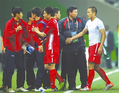6月25日,朝鲜队球员郑大世(右)退场时与主教练金正勋握手。