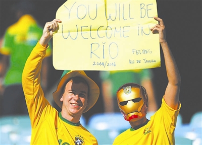 6月25日,巴西队球迷在比赛前打出“欢迎来到里约热内卢”的海报。2014年世界杯足球赛和2016年夏季奥运会将在里约热内卢举行。 新华社记者 陈海通 摄