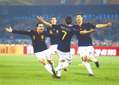 2010世界杯H组末轮:西班牙小组出线后,队员们手舞足蹈。