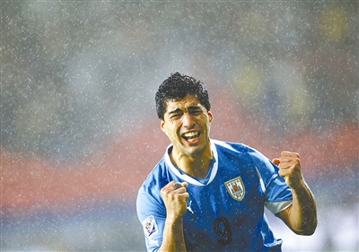 在与韩国队的八分之一决赛中攻入两球的乌拉圭球员苏亚雷斯进球后雨中狂奔庆祝。新华社发