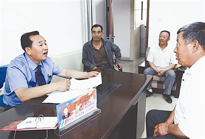 张章宝(左一)在接访室接待上访的村民(6月24日摄)。新华社记者 袁满 摄