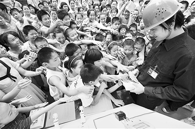 6月23日上午,青年志愿者向学生发放家庭安全用电画册。暑假前夕,河北省邯郸供电公司青年志愿者走进邯郸市特种教育学校,为学生们讲解家庭安全用电知识和节能用电常识,为这个无声的世界送去了一份关爱。李志文 摄