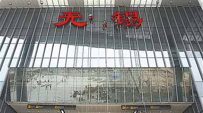 6月27日,工人对即将启用的城铁无锡站候车大厅玻璃外墙进行清洗。