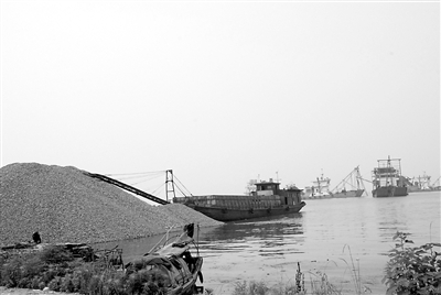 码头上砂石成堆,渔民的小船只能躲在岸边一角。本报记者田杰摄