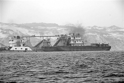 “吸沙王”作业时,冒着滚滚浓烟,同时发出巨大的响声。 本报记者田杰摄