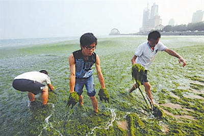 据国家海洋局北海分局目前监测,黄海中南部发现较多浒苔聚集区,部分浒苔已陆续在青岛海域登陆,覆盖面积约380平方公里。杨晓原 摄