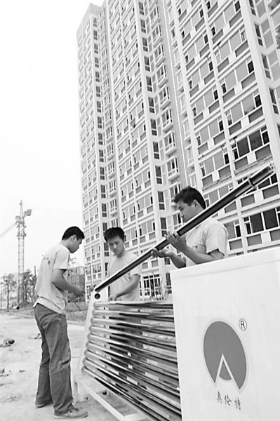 6月24日,山东奥伦特太阳能科技有限公司的工作人员正在安装由他们自主研发的壁挂栏板式太阳能一体机。这样既确保了太阳能光热系统的普及应用,又让太阳能与建筑物融为一体,相得益彰。