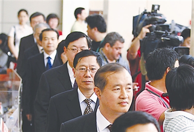 6月30日,中共中央对外宣传办公室在北京举行中共中央有关部门新闻发言人与中外记者见面会。中央纪委、中组部、中宣部等11个中共中央部门的新闻发言人首次集体亮相。图为中共中央宣传部新闻发言人李伟(前)、中共中央统一战线工作部新闻发言人张献生等步入发布会现场。 盛佳鹏 摄