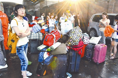6月29日上午,250余名开封大学学生坐了14个小时的长途车来到了上海,本指望趁着暑假在知名企业打工赚钱,怎知被黑中介欺骗,被撂在了这个陌生的地方。在闸北区相关部门的干预下,3名中介公司人员被控制,卷走的手续费当即退还。在民警的组织下,最后,250多名学生提起行李坐上了回开封的大巴车。图为学生们在上海茫然无助的情景。张金桥 摄