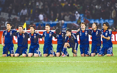 日韩球队在本届世界杯的表现,不是一般的好。1/8决赛,韩国人是在一场对攻战中光荣而悲壮地死去的,而日本队的出局更是让人叹惋。全场比赛他们没有让南美人占到半点便宜,但显然他们缺少点运气。日本人在巴拉圭队员罚点球时齐刷刷地跪下祈求上苍的镜头,或许会定格为本届世界杯的经典瞬间(下图)——这不是向对手的臣服,而是源于对胜利深深的渴求。