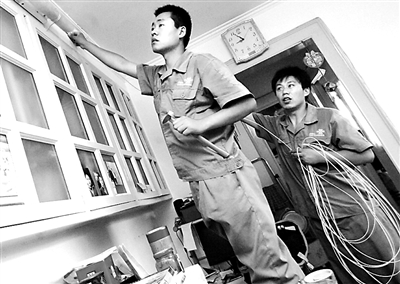 图为7月2日,北京联通技术人员在西城区某小区居民家中安装“20M宽带光纤”,为“三网融合”奠定基础。