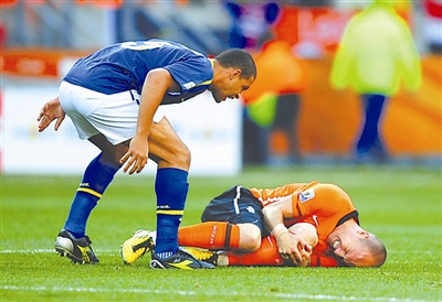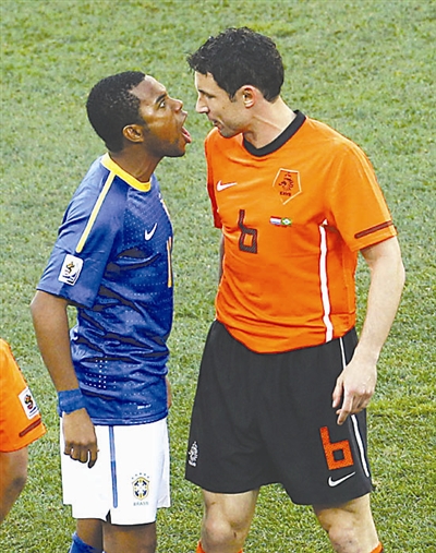与荷兰队的比赛,巴西队很亢奋,全攻全守积极拼抢让他们踢了20分钟好球并取得领先。但过度“亢奋”让他们把精力放在了凶狠的防守和不断对裁判、对手的狂吼上,罗比尼奥(上图)、梅洛(下图)、麦孔……情绪控制不当,让昨天的巴西队仿佛成了昔日的乌拉圭。当然,迷失的巴西只能自食苦果——下届东道主回家了。