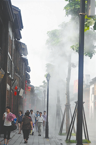 7月4日,被市民称为“大空调”的福州南后街水雾降温系统一经投入使用就吸引了许多市民和游客前来消暑。据了解,福州市古街水雾降温系统主要安装在南后街南北口风雨廊、蓝建枢故居外侧和南后街中段屋檐及大树上,大约每米布一喷雾口,不定时喷出的水雾可降温6℃左右。