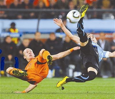 北京时间7月7日凌晨进行的世界杯荷兰队与乌拉圭队的半决赛中,双方队员拼抢激烈,同时倒地。