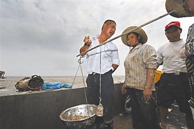 11时03分:来自安徽阜阳地区第一次赶海的韩俊平和妻子刘桂英,在大堤上经过收购海货的商贩过秤之后,按每斤8元的价格,给了他俩15元钱。他俩是凌晨4点起床,由韩俊平骑着自行车驮着妻子走了3个多小时才到海边的。韩俊平说:“我们是听了别人的介绍才来的,第一次下海没有经验,不知道啥样的淤泥中才有“海瓜子”,啥样的“海瓜子”能卖好价钱,所以,俩人捡的合在一块还不到2斤。”另外,他还说,“我们出门时没有带水,6个钟头下来,我老婆渴得都快晕过去了”。他介绍,“在安徽老家中我是优秀村民,2009年正月初五,我在冻河里两次冒着生命危险救过人,但是,不知道警察和记者为什么不采访我,而是让领导上了电视”。