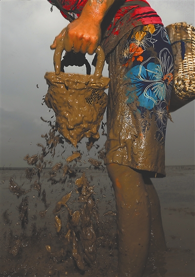 5时23分:退潮后的滩涂上,来自四川宜宾的几位妇女正在淤泥中摸捞“海瓜子”。从早上3时起床来到滩涂,她们要一直这样劳作到中午11时左右才上岸。一位熟练工一次下海所摸到的“海瓜子”能卖100元左右。