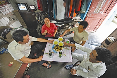 17时46分:来自四川省富顺县的唐敬明家按惯例由妻子烧了两个带有海货的荤菜,并叫了弟弟及邻居的一位单身小伙子喝了起来。他妻子说,早上为赶海起得太早没法吃舒服,中午还在滩涂上只能啃几口干粮,只有晚上回来,才能烧个菜喝点酒。唐敬明说:“一年之中赶海的季节大约4个月,其余时间就在当地找一点别的活干。我们春节多数不回老家,一年最多的也就挣一万多元,回一趟老家辛苦不说,钱就攒不下来了。”他还介绍,在慈溪的四川籍赶海人有近千人,虽然长年与海打交道,但很多人却连游泳都不会。去年9月份他们的老乡就因在滩涂上走得远了,潮水袭来时,有两位妇女被潮水卷走……`