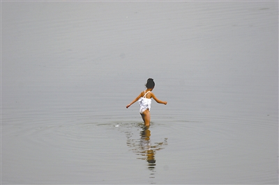 7月8日,一名小女孩独自在山东威海的九龙河中玩耍。