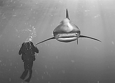 ——不少摄影师为拍到优秀作品,不惜冒生命危险。英国水下摄影师布赖恩·斯克里和同伴普拉特潜入巴哈马群岛附近海域跟踪一头白鳍鲨拍摄,时间长达2小时。白鳍鲨极其凶猛,斯克里的勇敢让他与这头鲨鱼面对面,并拍下珍贵照片。