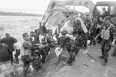 上图:7月11日上午10时,安徽桐城市大沙河青草段发生崩岸160米,严重地段达80米,武警安庆市支队110名官兵火速赶赴现场,投入堵缺战斗之中。