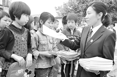 近日,河南省淅川县法院少儿审判法庭的法官深入该县水田营村小学,为该村移民儿童讲解法制知识。水田营村是国家南水北调工程中位于丹江口库区第一批准备迁往临县的村民,在即将迁移之际,“法官妈妈”多次来到该校,为移民儿童讲解有关法制知识和自我安全防范的措施,并给他们带来了书包、文具等文体用品,祝愿他们在迁移的学校里好好学习。
