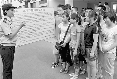 江苏省泗洪县公安局针对一些不法分子借高考录取之机进行诈骗的实际情况,深入该县城乡,将近年来涉及高考的几种诈骗手段及防范措施等内容印制成宣传牌或宣传单向今年参加高考的学生、学生家长、老师宣传。图为近日泗洪县公安局青阳派出所的民警在警务区内的江苏省泗洪中学,向即将填报高考志愿的“准大学生”作防范高考诈骗宣传。