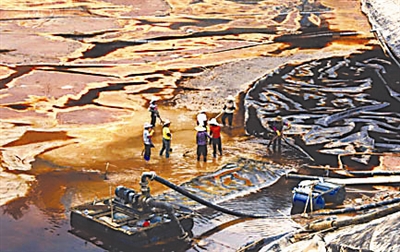 图为7月13日工人正在处理工厂污水池中的含铜酸水。 王东明 摄