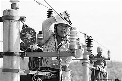 酷暑之际,浙江省宁波电业局通过各种竞赛活动提高员工专业技能,确保完成世博保供电、迎峰度夏安全供电任务。图为配电线路技术技能比武中,参赛的配电线路工人挥汗如雨,正在12米高的电线杆上更换1相绝缘子。唐瑾瑾 王幕宾 摄