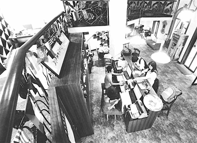 7月16日,上海南苏州路的九子公园旁,昔日沿河的一座老厂房被打造成了一家名为“苏州河畔”的背包族青年旅舍。尽管这里的住房有些类似“蜗居”,6人合住的房间里,双人床摆得满满当当,但收费仅80元一天,因而颇受“背包族”旅行者们的欢迎。图为旅舍接待大厅。 杨毅 摄