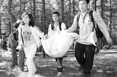 7月17日,来自呼和浩特市的旅游者在圣水梁森林草原旅游区清理野餐垃圾。入夏以来,很多呼和浩特市民走出家门,来到城郊的森林草原休闲避暑。“文明旅游、从我做起”的新风尚得到越来越多市民的响应。在各旅游景区,保护古迹、减少垃圾、爱护环境成为众多游客的自觉行动。新华社记者 张领 摄