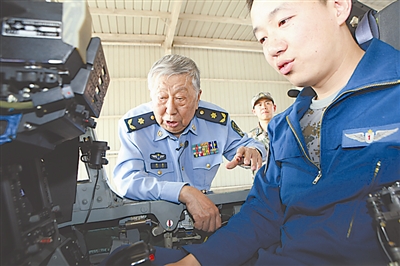 5月13日,阎肃在空军八一飞行表演队参观,和飞行员亲切交谈。 新华社发 (郭兴福 摄)