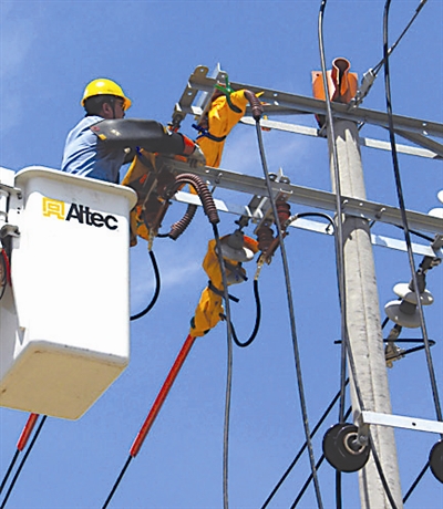 图为保定供电公司员工冒着酷暑带电作业的场景。刘克 摄