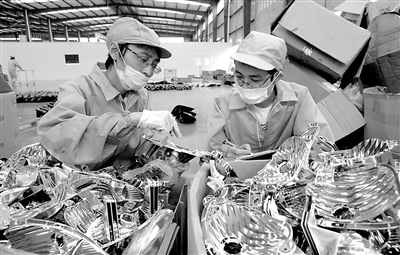 图为2名成功实现再就业的工人,正在新岗位上认真检查产品质量。
