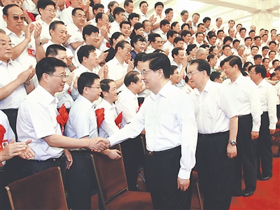 7月21日,全国党史工作会议在北京人民大会堂举行。会前,党和国家领导人胡锦涛、李长春、习近平、贺国强等亲切会见与会代表。 新华社记者 刘建生 摄